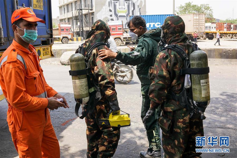 5月6日,在印度新德里,印度全國(guó)救災(zāi)應(yīng)急部隊(duì)成員準(zhǔn)備進(jìn)入煤氣泄漏事故發(fā)生地。據(jù)警方人員稱(chēng),新德里6日發(fā)生煤氣泄漏事故,約有200名學(xué)生出現(xiàn)不同程度的中毒癥狀入院治療。新華社/法新