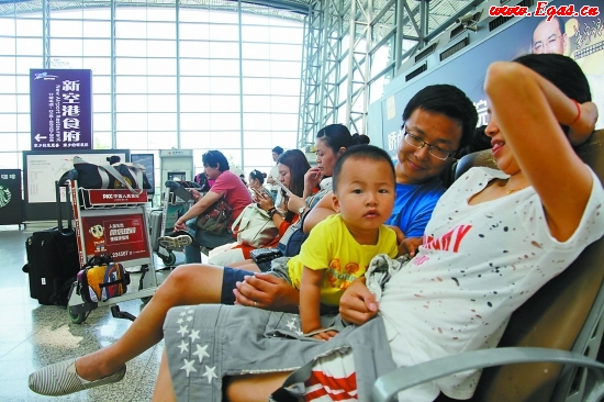 圖為即將踏上旅程的一家三口在候機。 范照明 伍帥 攝影報道