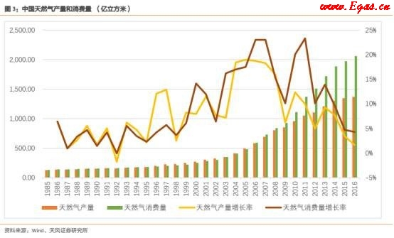 2016年中國(guó)天然氣消費(fèi)量2058億立方米,產(chǎn)量1368億立方米,供需缺口近700億立方米,對(duì)外依存度34%。自2014年起,中國(guó)天然氣的產(chǎn)量和消費(fèi)量增速均有所放緩,但消費(fèi)量的增速仍然持續(xù)大于產(chǎn)量的增速。隨著中國(guó)城鎮(zhèn)化過(guò)程中居民能源消費(fèi)結(jié)構(gòu)的變化,以及環(huán)保監(jiān)管日趨嚴(yán)格的背景下燃?xì)馓娲禾抗╇姽嵝枨蟮奶嵘烊粴庀掠蜗M(fèi)有進(jìn)一步增長(zhǎng)的空間。開(kāi)發(fā)國(guó)內(nèi)非常規(guī)天然氣、進(jìn)口管道氣、進(jìn)口LNG是解決中國(guó)天然氣供需缺口的三大主要途徑。