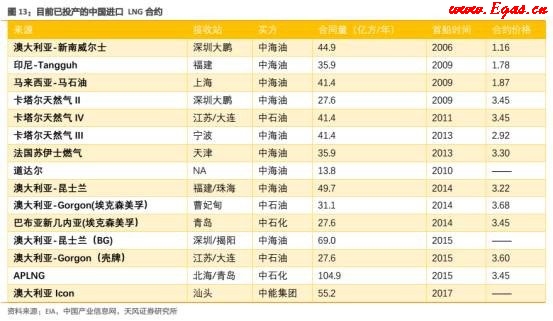 我國目前天然氣總消費量為1900億方,自產氣1300億方,陸上管輸氣為313億方,海上進口LNG氣270億方(長約氣220億方,現貨氣50億方)。雖然LNG現貨占比不高,但對我國整體氣價影響比較大。雖然中海油開始布局LNG進口時間較早,在LNG價格上漲之前簽下部分合約,但是三桶油大量的簽訂LNG進口合約都是發(fā)生在2014年底油價暴跌以前,以前普遍在3元/立方米以上,遠高于目前1.5元/立方米左右的進口氣現貨價格。目前已經簽約的海上LNG長約氣價格已經鎖定,在合同到期前價格不會有很大變化。未來新簽約的長約LNG氣價主要就是參考目前的現貨價格,并且一般會下浮10-15%。