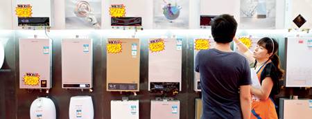 ▲ 顧客在選購(gòu)燃?xì)鉄崴?/p>