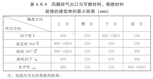 4.8.4建筑外墻燃具水平煙道風帽排氣出口與可燃材料、難燃材料裝修的建筑物的最小距離應符合表4.8.4的規(guī)定。