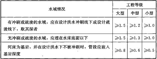 2 當(dāng)水域有拋錨或疏浚作業(yè)時(shí),管頂最小覆土厚度應(yīng)達(dá)到防腐層不受機(jī)械損傷的要求;