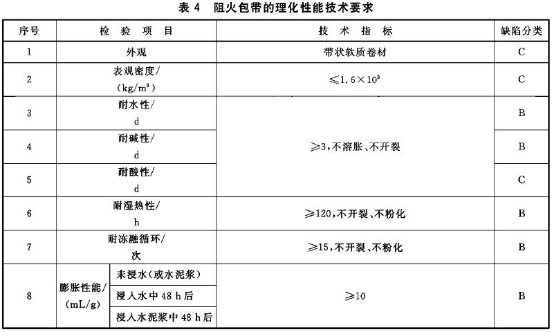 5.3.3  阻火包帶的理化性能應(yīng)符合表4的規(guī)定。