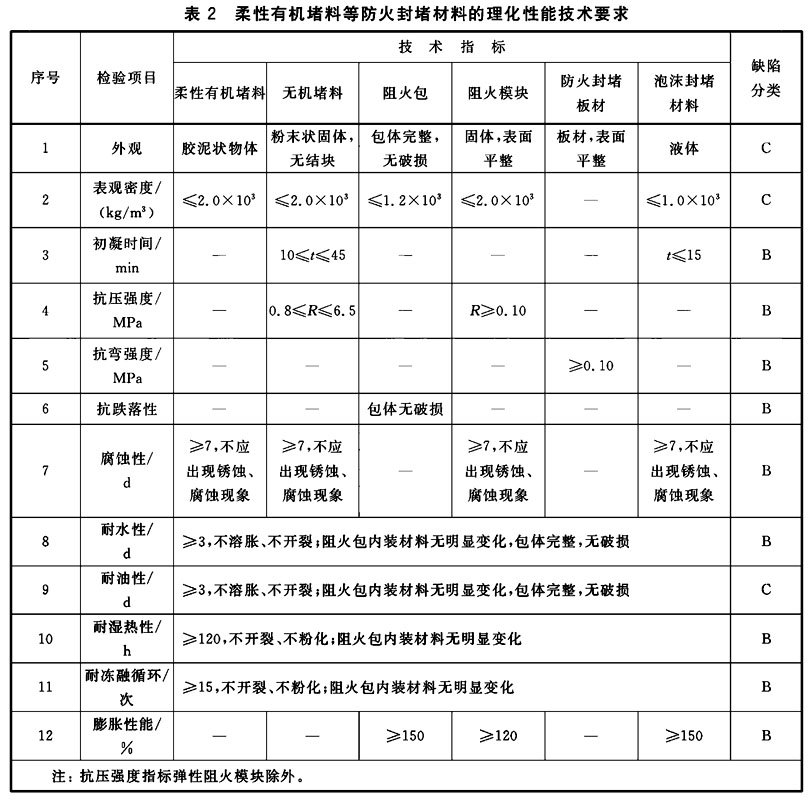 5.3.1  柔性有機(jī)堵料、無(wú)機(jī)堵料、阻火包、阻火模塊、防火封堵板材和泡沫封堵材料的理化性能應(yīng)符合表2的規(guī)定。