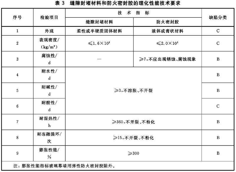 5.3.2  縫隙封堵材料和防火密封膠的理化性能應(yīng)符合表3的規(guī)定。