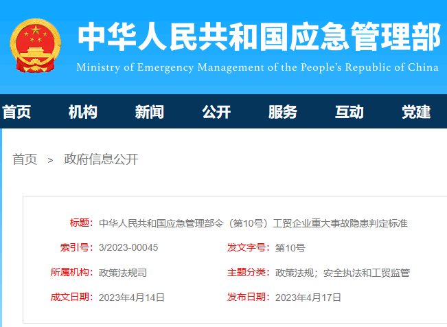 《工貿(mào)企業(yè)重大事故隱患判定標(biāo)準(zhǔn)》已經(jīng)2023年3月20日應(yīng)急管理部第7次部務(wù)會議審議通過,現(xiàn)予公布,自2023年5月15日起施行。