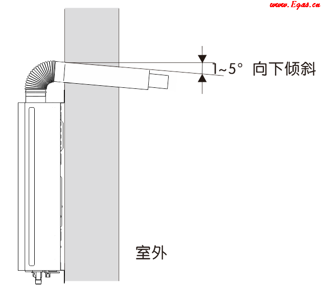 • ⑤ 排煙管應(yīng)有朝外向下1~5°的角度,以利于冷凝水流出;通過可燃墻壁時,應(yīng)有≥20mm厚度絕緣材料分隔及覆蓋;