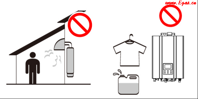 • ④ 安裝前確認(rèn)熱水器安裝的場所具有良好的通風(fēng)換氣效果,附近無易燃易爆及腐蝕性的危險品;