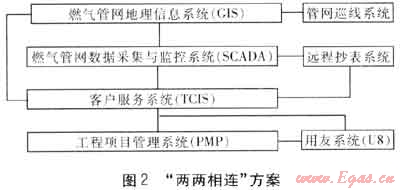 出于費用方面的考慮,公司決定先進行系統(tǒng)流程方面的整合,采用了“兩兩互連”的方案,后逐步進行界面統(tǒng)一、數(shù)據(jù)挖掘和決策支持方面的整合。到目前為止,實現(xiàn)了燃氣管網(wǎng)地理信息系統(tǒng)(GIS)與客戶服務系統(tǒng)(TCIS)、燃氣管網(wǎng)地理信息系統(tǒng)(GIS)與管網(wǎng)巡線系統(tǒng)、工程項目管理系統(tǒng)(PMP)與用友系統(tǒng)(U8)的系統(tǒng)流程整合,實現(xiàn)了數(shù)據(jù)的互連互通,取得了良好的效果。在數(shù)據(jù)挖掘分析方面,目前正在加緊進行仿真系統(tǒng)的引入。