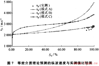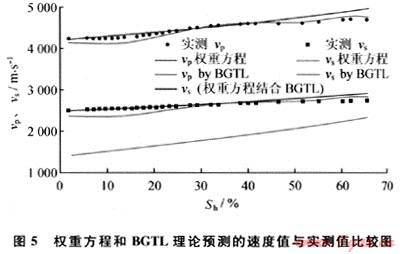 在固結(jié)沉積物實(shí)驗(yàn)中,筆者發(fā)現(xiàn)低飽和度的水合物(飽和度小于10%)對(duì)聲速影響不明顯的現(xiàn)象,這種現(xiàn)象也被不同學(xué)者所捕捉[19~20]。經(jīng)上述分析后認(rèn)為,水合物在沉積物孔隙流體中形成,對(duì)聲速影響不大,可能是造成這一現(xiàn)象的原因。而當(dāng)水合物膠結(jié)沉積物顆粒時(shí),其對(duì)聲速的影響則可能成倍增長(zhǎng),如在松散沉積物中,微量的水合物(飽和度1%左右)即可使縱波速度增長(zhǎng)200~300m/s??梢?,在天然氣水合物的資源評(píng)價(jià)中,了解水合物的微觀分布同樣具有重要的作用。