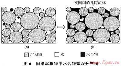 水合物的微觀分布對(duì)沉積物內(nèi)氣體運(yùn)移通道具有重要影響:在固結(jié)沉積物中,水合物在飽和度大于30%后膠結(jié)沉積物顆粒,使沉積孔隙中部分流體被“封閉”,得不到氣源的供給而不能進(jìn)一步生成水合物;而在松散沉積物中,大部分水合物因在孔隙流體中生成(只有最初1%飽和度的水合物膠結(jié)沉積物顆粒),未堵塞流體運(yùn)移通道,因此水合物幾乎能完全充填孔隙。