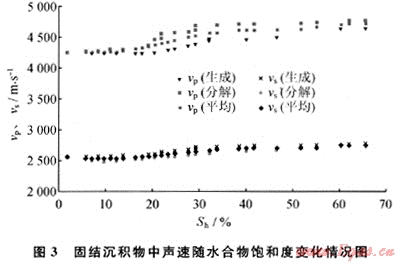 水合物的微觀分布對(duì)沉積物的聲學(xué)性質(zhì)具有重要影響:在固結(jié)沉積物中,由于在孔隙流體中生成,0~10%飽和度的水合物對(duì)聲速影響甚??;在松散沉積物中,由于水合物膠結(jié)沉積物顆粒生成,微量的水合物(飽和度1%左右)使縱波速度陡增。這表明,了解水合物的微觀分布對(duì)水合物資源估算具有重要的指導(dǎo)作用。
