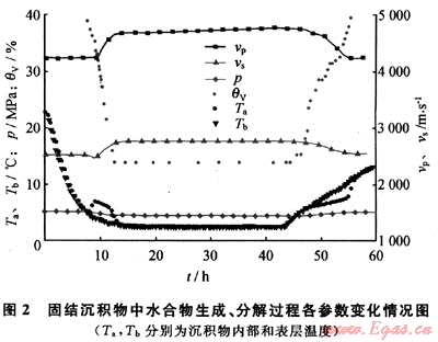 松散沉積物為采自于青島海邊的天然砂,粒徑為0.18~0.25mm,其物質(zhì)成分及含量如表2所示。由于難以探測(cè)松散沉積物的橫波速度,本文實(shí)驗(yàn)僅獲取了縱波速度隨水合物生成和分解的變化情況(圖4)。結(jié)果表明,水合物剛開始生成時(shí),縱波速度有一個(gè)陡然增大的現(xiàn)象,隨后由于超聲衰減極大,縱波速度難以獲取[13]。水合物完成生成時(shí),含水合物松散沉積物的縱波速度為278m/s左右,比含飽和水沉積物的聲速增長(zhǎng)1000m/s左右。