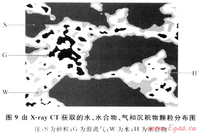 松散沉積物中的水合物微觀分布已由Jin等[18]通過X射線斷層掃描直接觀測(cè)(圖9)。結(jié)果表明水合物和沉積物顆粒間由水隔開,即水合物以懸浮狀形態(tài)存在于孔隙流體中,與筆者實(shí)驗(yàn)中利用聲速所推測(cè)的結(jié)果一致。