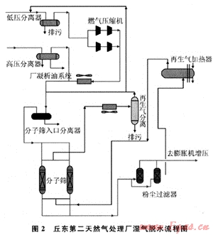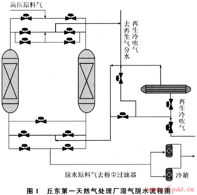 原料氣進(jìn)裝置區(qū)后首先進(jìn)入分離器除去游離水和機(jī)械雜質(zhì),然后在6.5MPa、25℃條件下進(jìn)入分子篩干燥器,脫水后干氣露點(diǎn)小于-80℃,干氣進(jìn)入旋風(fēng)分離器除去分子篩粉末,最后進(jìn)入輸氣管線。流程如圖1所示: