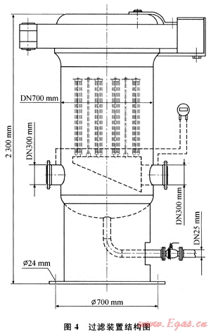 4) 改進(jìn)過濾裝置,采用HFB/150天然氣高效沉降過濾器,該裝置過濾器由沉降段及過濾段兩部分組成,沉降段由分隔板構(gòu)成一個(gè)重力沉降室;過濾段安裝有若干只濾芯。當(dāng)含塵氣體進(jìn)入分離器時(shí),在重力作用下先將粗顆粒雜質(zhì)分離,從而減輕了后續(xù)精密濾芯的負(fù)荷,較細(xì)的雜質(zhì)則隨著氣體由過濾段的濾芯除去,最終氣體得以凈化。改進(jìn)后的過濾器裝置結(jié)構(gòu)圖見圖4。
