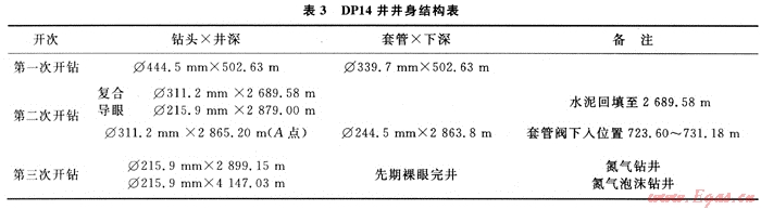 表3給出了DP14井井身結(jié)構(gòu)。該井將Ø244.5mm技術(shù)套管下至A點(diǎn),封隔住上部地層,以便于水平段欠平衡鉆進(jìn)的順利實(shí)施。為了實(shí)現(xiàn)全過程欠平衡鉆完井,該井水平段采用先期裸眼完井。