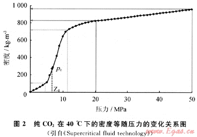 臨界流體是指溫度、壓力高于臨界溫度(Tc)和臨界壓力(pc)的流體。在臨界點(diǎn)附近,壓力的微小變化可導(dǎo)致密度的巨大變化[9]。如圖1、2。圖1中,C點(diǎn)為流體臨界點(diǎn),虛線所標(biāo)注的數(shù)值為流體密度。由圖1可以看出,在C點(diǎn)附近小的范圍內(nèi),流體的密度差異巨大,也即流體密度差異很大的數(shù)值線延伸并聚集在臨界點(diǎn)C附近。在此點(diǎn),較小的溫度或壓力發(fā)生變化,都會(huì)引起流體密度或體積的巨大變化。純二氧化碳的臨界溫度是31.06℃,臨界壓力是7.39MPa,如圖2描述了純二氧化碳在40℃下的密度隨壓力的變化關(guān)系。溫度40℃恒定的條件下,壓力從10MPa降到5MPa,在臨界壓力附近變化,密度數(shù)值從630kg/m3降到120kg/m3,變化劇烈;可見在臨界點(diǎn)附近,密度有很寬的變化范圍;溫度或壓力微調(diào)可使密度顯著變化。