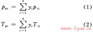 穩(wěn)定的純物質(zhì)及由其組成的定組成混合物具有固有的臨界點(diǎn)(即臨界壓力pc、臨界溫度Tc、臨界密度ρc)。混合氣體組分的臨界參數(shù)的計(jì)算方法如下[8]: