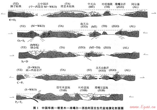 2) 早古生代大洋旋回對(duì)中國(guó)古大陸演化格架影響極大,由于各大洋旋回的差異,使各陸塊或不同陸塊邊緣的原型盆地演化不同,與此呼應(yīng)的各陸塊內(nèi)盆地演化也有所不同。