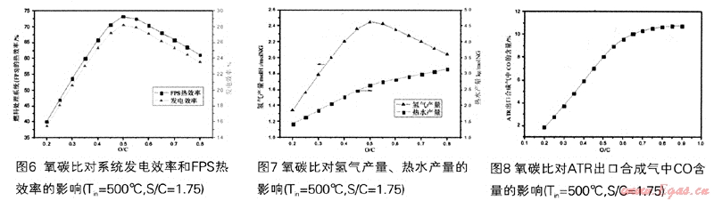 氧碳比對(duì)于自熱重整制氫技術(shù)是一個(gè)重要的參數(shù)。隨著氧碳比的增大,甲烷氧化反應(yīng)增強(qiáng),因此ATR合成氣中CO的含量也會(huì)增大,如圖8所示。氧化反應(yīng)的進(jìn)行使反應(yīng)溫度升高,ATR出口合成氣溫度升高,熱水產(chǎn)量也會(huì)隨之增大,如圖7所示。反應(yīng)溫度的提高也會(huì)使強(qiáng)吸熱的蒸汽重整反應(yīng)加強(qiáng),H2產(chǎn)量也會(huì)有所提高,但是當(dāng)0/C>O.5以后,過多的氧氣在高溫狀況下會(huì)消耗氫氣,這樣會(huì)導(dǎo)致H2產(chǎn)量的下降。O/C=0.5時(shí),H2產(chǎn)量達(dá)到最大(2.45molH2/molNG),系統(tǒng)發(fā)電效率和FPS的熱效率都在峰值處(28.2%,73.3%),如圖6所示。