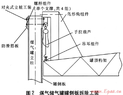 ② 煤氣儲(chǔ)氣罐側(cè)板拆除過(guò)程中,罐頂作為施工平臺(tái)在下降過(guò)程中,應(yīng)統(tǒng)一指揮,同步操作,確保手拉葫蘆的同步性;鳥(niǎo)形鉤及立柱工裝的固定一定要作好安裝質(zhì)量檢查,確保安全使用。