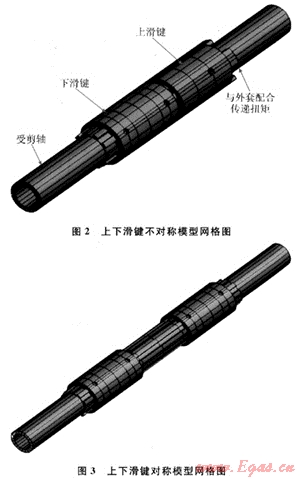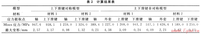表2給出了兩種模型的主要結(jié)果數(shù)據(jù)。從表2中可以看出:對于上下滑鍵非對稱模型,其高應(yīng)力主要集中在上滑鍵與外套的連接處,軸上最大應(yīng)力只有389.4MPa,遠(yuǎn)沒有達(dá)到受剪軸的承載極限,而外套和上滑鍵的連接處其局部應(yīng)力均已超過材料的極限承載能力。也即是說,外套和上滑鍵已經(jīng)破壞,整個(gè)結(jié)構(gòu)已經(jīng)失效,而此時(shí)受剪軸還處于完全彈性狀態(tài),整個(gè)結(jié)構(gòu)的應(yīng)力和變形很不協(xié)調(diào);對于上下滑鍵對稱模型,由于材料選取的不同,導(dǎo)致兩種模型的應(yīng)力值差別較大,模型2的材料屈服應(yīng)力高,得到的應(yīng)力分布結(jié)果也較大;但是其應(yīng)力分布無明顯差別,中軸的受剪效果均很明顯。