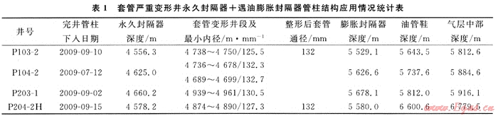 普光氣田套管變形井發(fā)生后,通過普光氣田主體嚴(yán)重套管變形井綜合修井技術(shù)研究,采用井下震擊整形技術(shù)、滾壓整形技術(shù)實現(xiàn)套管擴徑,普光103-2、204-2H井整形后通徑達到132~134mm,保證小直徑遇油膨脹封隔器下井的要求;2009年7~9月份應(yīng)用外徑130mm遇油膨脹封隔器,采用“永久封隔器+遇油膨脹封隔器”采氣管柱結(jié)構(gòu),先后完成了普光103-2、104-2、203-1定向井、204-2H水平井投產(chǎn)作業(yè)施工,現(xiàn)場應(yīng)用效果較好(見表1),對高含硫嚴(yán)重套管變形井修井投產(chǎn)具有重要現(xiàn)實意義。