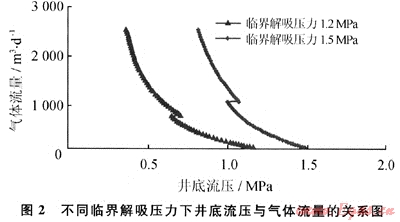 圖2顯示了在煤層供氣充足的條件下井筒中井底流壓與氣體流量的關(guān)系,可見(jiàn)井底流壓與氣體流量呈負(fù)相關(guān)關(guān)系,氣體流量隨井底流壓降低而增加。在解吸產(chǎn)氣初期,井底流壓下降快,但氣產(chǎn)量增長(zhǎng)緩慢,表明產(chǎn)氣初期煤層壓降漏斗范圍小,供氣有限;隨著井底流壓不斷下降,地層壓降漏斗逐漸擴(kuò)大,井底流壓下降較小的值就能產(chǎn)出大量的煤層氣。煤層氣臨界解吸壓力越高,井底壓力下降相同的數(shù)值產(chǎn)出的氣體越多。這反映了煤層氣井的地下滲流壓力變化特征。