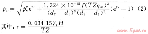 對(duì)于上部純氣體段的流動(dòng)狀態(tài)可認(rèn)為是霧流,可以根據(jù)天然氣干氣井井底流壓的計(jì)算方法計(jì)算氣柱產(chǎn)生的壓力[5]。即