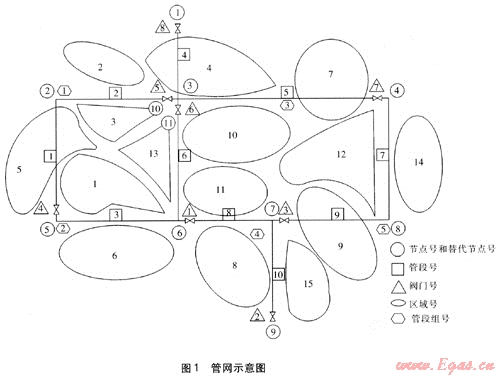 當(dāng)管網(wǎng)中管段或閥門發(fā)生故障、泄漏時,借助GIS確定應(yīng)該關(guān)閉的閥門并給出因此而被影響或中斷供氣的供氣區(qū)域。為賦予GIS系統(tǒng)這種故障管段隔離決策功能,可以通過經(jīng)驗(yàn)的方法建立相應(yīng)的決策數(shù)據(jù)庫,但為使決策過程科學(xué)化,應(yīng)該研究應(yīng)用于GIS的管網(wǎng)故障管段隔離決策算法(簡稱管段隔離決策算法)。