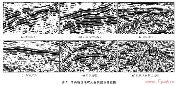 不同的地震相對應一定的火山巖巖相,詳細劃分地震相有利于進一步分析該地區(qū)火山巖巖相的分布。通過研究劃分出陸西地區(qū)石炭系火山巖地震反射特征主要有以下幾種:舌狀或楔狀反射、板狀反射、弧狀反射、丘狀或蘑菇狀等反射特征(圖2)。