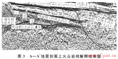 弧狀反射主要反映噴溢而出的熔巖流層,大多沿地形傾覆趨勢由高向低發(fā)展,反射同相軸呈弧形,由2到3個相位組成,表現(xiàn)為連續(xù)的強振幅和強反射,弧形下伏部位常由于屏蔽而表現(xiàn)為較弱的反射特征,一般比較雜亂或空白無反射(圖2-e),這主要是由偏基性的玄武質(zhì)巖漿形成的。玄武質(zhì)巖漿黏度較小,易于流動,噴發(fā)到地表后,往往朝著地形低洼處流動,因而玄武巖分布受古低洼地形控制較明顯。