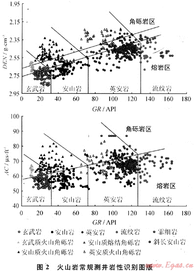 3) 通過巖心、薄片刻度測井建立火山巖常規(guī)測井巖性識別圖版?;鹕綆r巖性識別是建立火山巖巖相模式、識別火山巖體的基礎(chǔ),以巖心、薄片刻度測井建立火山巖常規(guī)測井巖性識別圖版,充分發(fā)揮了各自的作用。基于47口井631塊巖石薄片巖性分析數(shù)據(jù)建立的圖版如圖2所示,由圖2可知,從基性巖到酸性巖,GR變大、DEN減小、AC增大的特征清晰,規(guī)律明顯。