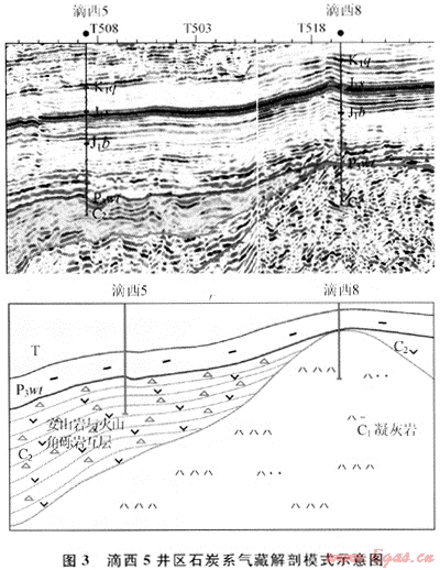 2006年通過井震結(jié)合對滴西5井區(qū)進(jìn)行了解剖,從巖性巖相變化模式確定滴西5和滴西8井區(qū)石炭系為不同的巖相巖體,認(rèn)為滴西5井以火山角礫巖為儲層,以安山巖為隔層,氣藏類型為受火山巖(角礫巖)巖性控制的層狀地層氣藏,而不是以前認(rèn)識的構(gòu)造氣藏(圖3)。