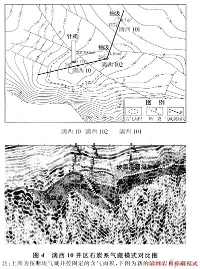 2) 滴西10井區(qū)。滴西10井鉆于2003年,石炭系巖性為流紋巖,2004年在石炭系試氣2層均獲得高產(chǎn)工業(yè)氣流。按照頂面構(gòu)造控藏模式,2004、2005年分別鉆探滴101井和滴102井2口評價井,石炭系巖性均為凝灰?guī)r,無油氣顯示。2005年底,按斷鼻構(gòu)造氣藏圈定滴西10井井控面積4.74km2(圖4中的上圖),探明天然氣地質(zhì)儲量20.20×108m3。2006年,對滴西10井區(qū)按巖性圈閉模式進(jìn)行了重新解釋,提出了新的氣藏模式(圖4中的下圖),并對滴102井進(jìn)行了加深鉆探以驗(yàn)證新模式。滴102井于3310m開始加深,3460m完鉆,至3340~3370m井段鉆遇流紋巖與滴西10井出氣段巖性一致。鉆探結(jié)果證實(shí)了新模式的正確性,指導(dǎo)了后續(xù)探井的部署。2008年,按照巖性巖相控藏模式,鉆探了滴103井和滴104井,均獲得成功,新增含氣面積13.57km2,新增探明天然氣地質(zhì)儲量83.07×108m3。