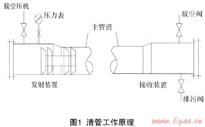 管道清掃時(shí),將具有一定過盈量的清管器置于管道中,使之外沿與管道內(nèi)壁形成良好的彈性密封,然后輸入介質(zhì)(通常為壓縮空氣或水),使清管器前后產(chǎn)生足夠的壓差,推動清管器在管內(nèi)運(yùn)行(如圖1)。