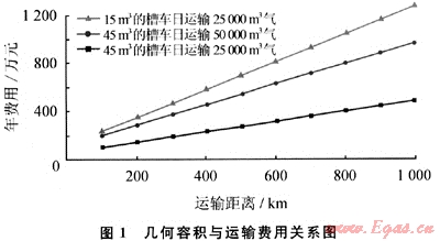 若采購(gòu)相同幾何容積的槽車(chē)來(lái)運(yùn)輸LNG,可得幾何容積與運(yùn)輸成本的關(guān)系(如圖1所示)。