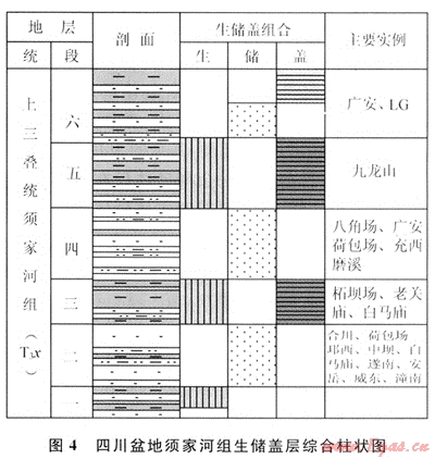 四川盆地上三疊統(tǒng)須家河組是在中三疊世雷口坡期侵蝕面基礎(chǔ)上沉積的典型陸相煤系碎屑巖沉積,縱向上一般可細(xì)分為6個巖性段(圖1),其中,須一、須三、須五段以泥巖、頁巖為主夾薄層粉砂巖、碳質(zhì)頁巖和煤線,為湖泊沼澤環(huán)境沉積的產(chǎn)物,形成的煤系烴源巖大面積分布;須二、須四、須六段以大型三角洲沉積的灰色、細(xì)-中砂巖為主,形成的水下分流河道砂體大面積分布。生、儲層的交互發(fā)育構(gòu)成了須家河組“三明治”結(jié)構(gòu)的良好空間配置關(guān)系(圖4),有利于大面積成藏,提高了聚集效率。