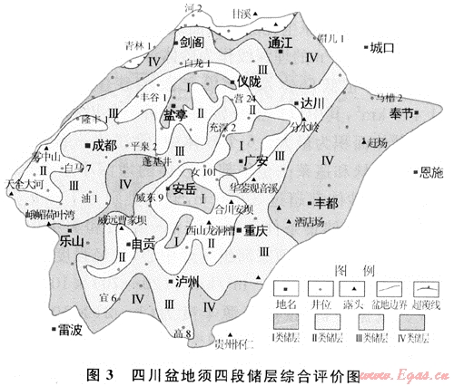 須四段主要以Ⅱ、Ⅲ類儲層為主,Ⅰ類儲層分布較少。Ⅰ類儲層儲層范圍比須二段廣,主要分布在荷包場、潼南、廣安、八角場及蓬基等地區(qū),這些地區(qū)巖石成熟度較高,雜基和軟性巖屑含量較少,成巖相主要為綠泥石膠結(jié)相和溶蝕相,都位于三角洲水下分流河道微相帶,原生粒間孔隙保存較好,同時長石含量高,又位于(或鄰近)生烴中心,溶蝕作用強(qiáng)烈。Ⅱ類儲層的分布主要位于充深、蓮池、威東、營山和川西南地區(qū)(圖3)。