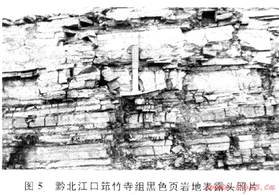 研究區(qū)下寒武統(tǒng)黑色頁巖主要發(fā)育于川南、黔北及黔東北-湘鄂西一帶,均以濱海沼澤及淺水缺氧停滯濱淺海沉積為主,與最大海泛面相對應(yīng)的低能黑色頁巖(包括碳質(zhì)頁巖和硅質(zhì)頁巖)相吻合,為克拉通基底盆地內(nèi)的第一套區(qū)域性烴源巖(屬于腐泥型有機質(zhì)類型,見表1),現(xiàn)今埋深在2000~4000m之間(圖4),總有機碳含量平均為2.74%[20]。其中,張家界實測總有機碳含量平均為7.7[21],Ro值平均為3.16%,處于高過成熟階段[22]。在野外實測剖面和井下巖心觀察中均發(fā)現(xiàn)了十分發(fā)育的裂縫(圖5),經(jīng)對研究區(qū)內(nèi)的老井進行復(fù)查(威5、威18等井),已在該套頁巖中發(fā)現(xiàn)普遍存在的氣顯異常[23、24]。