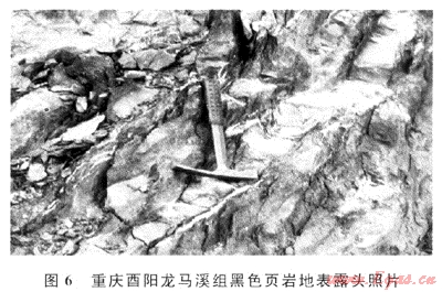 區(qū)內(nèi)上奧陶統(tǒng)-下志留統(tǒng)筆石頁巖普遍發(fā)育且分布穩(wěn)定,深灰色、黑色碳質(zhì)、硅質(zhì)泥頁巖埋深在1500~4000m之間,有機質(zhì)類型均屬腐泥型,殘余總有機碳含量平均為2.28%[20],目前多處于高成熟演化階段[22],成熟度平均值均大于1.5%。在最近完鉆的探井中(如丁山1井、建深1井龍馬溪組),氣顯示(井涌及氣測等)異常在鉆井過程中頻繁出現(xiàn)[11、26]。依據(jù)頁巖類型和礦物學(xué)特征分析表明:該套頁巖具有脆性巖石組分[26],野外實測剖面中可見風(fēng)化的頁巖破碎帶(圖6),在鉆井巖心中也發(fā)現(xiàn)了十分發(fā)育的高角度微裂縫,指示該區(qū)頁巖易于發(fā)生脆性裂縫。