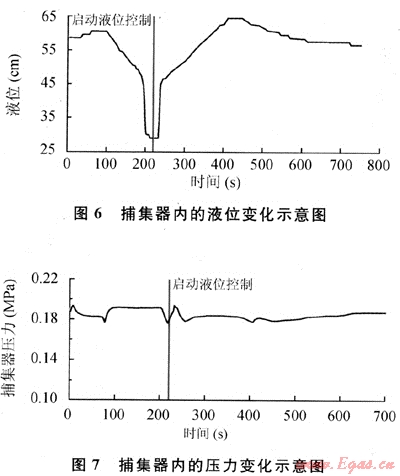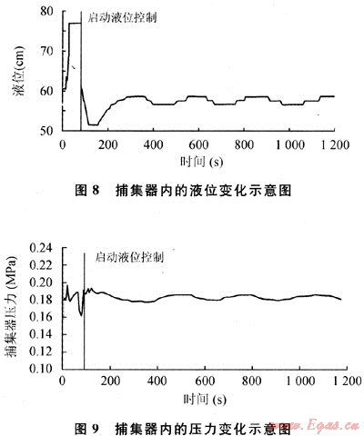 由圖6、7可知,在這一工況中,液位控制系統(tǒng)啟動前,捕集器內(nèi)液位會慢慢降低,直至最低,在液位低于30cm時,就會有大量氣體從捕集器液體出口溢出,導(dǎo)致捕集器內(nèi)壓力不穩(wěn)定。液位控制系統(tǒng)啟動后,液位先增高然后逐漸達到穩(wěn)定工況,捕集器內(nèi)壓力也趨于平穩(wěn),沒有大幅度的上升或降低。