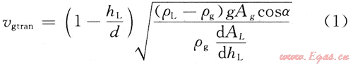 當(dāng)來流為段塞流時,進入捕集器后轉(zhuǎn)化為分層流,根據(jù)Taitel和Dukler的轉(zhuǎn)變準(zhǔn)則判斷,可以計算出一定傾角下,滿足流型轉(zhuǎn)化的管徑D,詳見公式(1):
