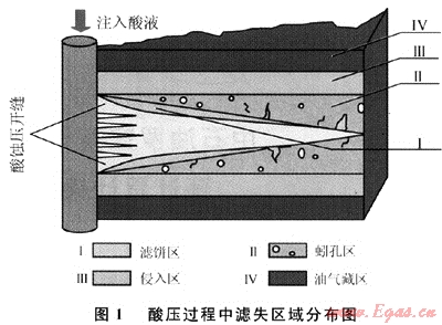 由于蚓孔地層的濾失,降低了酸液實(shí)際有效作用距離,增加的注液量?jī)H對(duì)近井帶的儲(chǔ)層改造,最終導(dǎo)致增產(chǎn)效果不理想。因此,實(shí)際酸壓過(guò)程中酸液的濾失主要包括裂縫壁面向基質(zhì)的濾失和酸蝕蚓孔濾失兩部分[6],并且細(xì)分為4個(gè)區(qū)域(圖1)。其中,酸液濾失主要受到蚓孔區(qū)(Ⅱ)內(nèi)蚓孔擴(kuò)展速度及侵入?yún)^(qū)(Ⅲ)內(nèi)與流動(dòng)剪切及裂縫溫度有關(guān)的酸液黏度所控制。另外,地層一旦形成蚓孔,酸液濾失則主要在蚓孔內(nèi)發(fā)生,濾失量由蚓孔擴(kuò)展體積和酸液向酸蝕螞孔壁面濾失量共同決定。