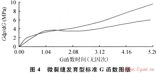其特征主要表現(xiàn)為主裂縫閉合前G函數(shù)曲線有一定凸起,一般數(shù)值在4以下(圖4)。該類儲(chǔ)層閉合前由于受微裂縫濾失影響,造成裂縫濾失不恒定且濾失較大。