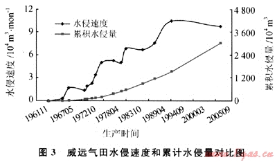 研究威遠(yuǎn)氣田各個(gè)生產(chǎn)時(shí)段水侵速度與生產(chǎn)曲線的對(duì)比(圖4)可知,威遠(yuǎn)氣田生產(chǎn)初期的采氣速度較大,整體水侵速度較小,在開(kāi)始提高采氣速度后水侵逐漸加劇。當(dāng)氣田開(kāi)采進(jìn)入中期,采氣速度開(kāi)始逐漸減小時(shí),產(chǎn)水速度開(kāi)始逐漸增大,并呈臺(tái)階式波動(dòng),同時(shí)水侵速度也呈現(xiàn)出一種階梯式的遞增,表明威遠(yuǎn)氣田受水侵的影響是在生產(chǎn)中期逐漸加大的,采用氣田內(nèi)排水的方式加劇了裂縫性水竄;隨著氣藏開(kāi)發(fā)進(jìn)入生產(chǎn)末期,氣田內(nèi)生產(chǎn)井大量排水形成了水侵通道,水侵速度到達(dá)最大值,造成許多氣井在短時(shí)間內(nèi)大量見(jiàn)水,但由于底水水體的彈性能量大量釋放以后,水侵能量減弱,水侵速度已經(jīng)開(kāi)始表現(xiàn)出逐漸減小的趨勢(shì)。