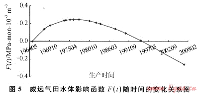 另一方面,從函數(shù)F(t)隨時(shí)間的變化關(guān)系曲線(圖5)可知,在威遠(yuǎn)氣田開(kāi)井投產(chǎn)初期,由于采氣速度高、底水沿裂縫竄進(jìn)侵入氣藏、水體能量表現(xiàn)為逐漸增大;在進(jìn)入生產(chǎn)中期時(shí),水體的彈性能量開(kāi)始逐漸減弱,水體的膨脹程度開(kāi)始逐漸減小,進(jìn)入生產(chǎn)末期后,使函數(shù)F(t)形成一種持續(xù)下降甚至為負(fù)值,表明隨著水體能量的大量釋放以及受威遠(yuǎn)氣田大面積關(guān)井影響,部分地層水有可能出現(xiàn)沿大裂縫系統(tǒng)回退的現(xiàn)象,說(shuō)明整個(gè)水體能量表現(xiàn)為具有可排性,如果在合適的位置打排水井大量排水,可使氣藏的采收率得到大幅度地提高。