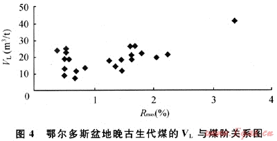煤階是影響煤對甲烷吸附能力最為重要的因素。Kaiser等[18]認為,在煤化作用階段早期,煤中發(fā)育的孔隙主要為原生大孔隙且含有大量的羥基和羧基官能團,此時煤親水而疏甲烷,造成平衡水分含量非常高,但吸附能力較低,隨煤階增高,原生大孔隙急劇減少,熱變氣孔逐漸增多,羥基和羧基官能團大量脫落,使得煤的親甲烷能力顯著增加,同時熱變氣孔的大量形成,為甲烷吸附提供了空間[18~19],所以高煤級煤對甲烷的吸附能力一般強于低煤級煤。盆地晚古生代煤的VL隨熱成熟度提高呈“U”型趨勢變化(見圖4),當(dāng)0.40%<Rmax<0.80%時,隨煤階增大,煤對甲烷的吸附能力迅速下降,以Rmax=0.8%為臨界點,在0.8%<Rmax<4.0%時,最大吸附氣量隨煤階增大而增加。由于盆地中深部目前沒有實測的VL數(shù)據(jù),參考盆地邊淺部煤的U在0.8%<Rmax<4.0%區(qū)間內(nèi)隨煤階的變化規(guī)律,筆者根據(jù)中深部煤的熱成熟度分布特點對煤的最大吸附能力進行了推測,并結(jié)合現(xiàn)存煤炭資源量推算出全盆地中深部晚古生代煤對甲烷的理論吸附氣量為51.92×1012m3。